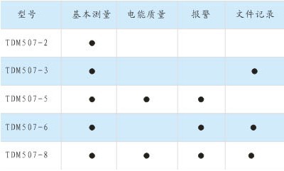 TDM507是新一代高端多功能电力分析仪表,适用于智能化高中低压各型配电系统。具备检测电气设备所需的电压、电流、功率、电度、频率、谐波、相序等测量分析功能,还可以控制断路器的分合闸操作,设置故障报警及电能质量分析。具有全中文汉化的大屏幕液晶显示,可以同时监测并显示多种电力参数。丰富的I/O及用户界面使TDM507成为一个电力监控平台,非常适用于非线性负荷系统等电力质量恶劣的环境或对电力质量要求很高的系统。 功能配置表