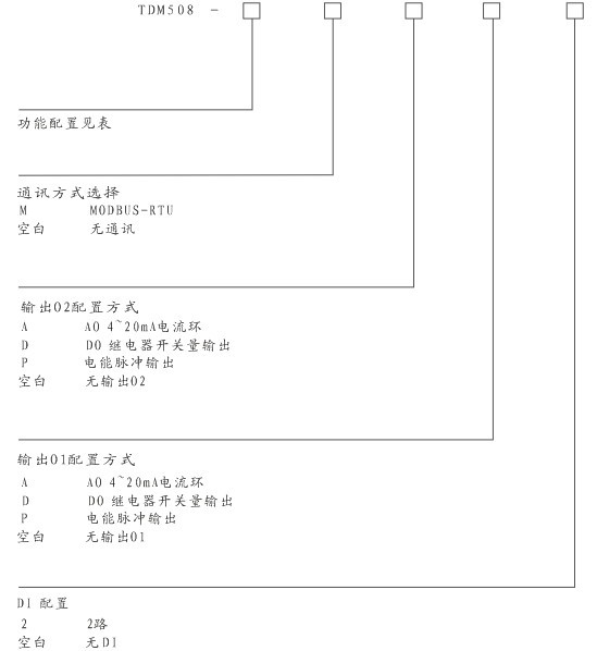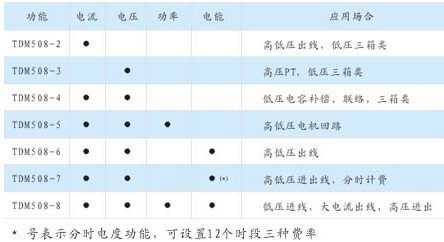 TDM508系列多功能配电仪表可以准确可靠地测量电力系统的基本参数,包括三相电流、电压、功率、功率因数、频率、电能等,还可以选择分时电能功能,实现分时计费;采用高亮度LED显示,简洁的双键操作界面,方便使用;RS485接口,标准MODBUS-RTU通讯协议;同时可选择4-20mA模拟输出;2路DI开关量输入/2路DO继电器开关量输出,可以满足绝大多数应用,能够集成到任何电力监控系统中,能够支持多种组态软件,方便进行现场的组态和建立监控网络以及实施各种监控策略。 功能配置表(LED显示)